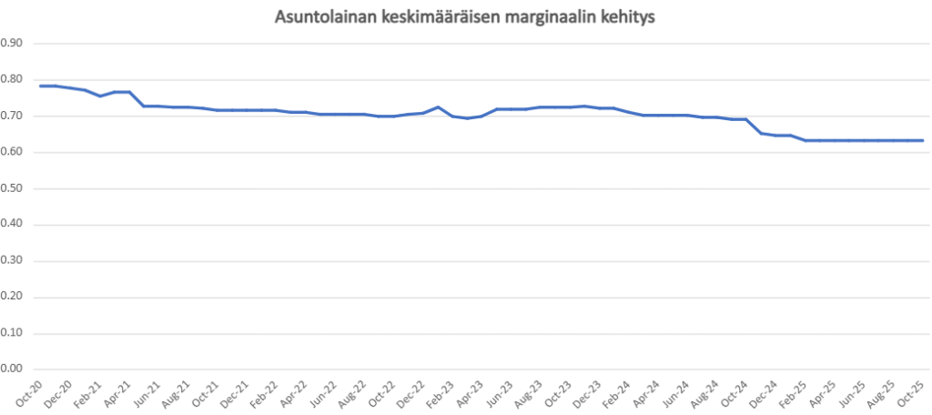 Lokakuun 2025 alussa vertailupankkien keskimarginaali oli 0,65 prosenttia. Uuden asuntolainan keskimääräinen todellinen kokonaiskorko oli lokakuussa 2,93 prosenttia. Vertailussa mukana olevien pankkien marginaalit vaihtelivat nyt pankeittain 0,60 – 0,80 prosentin haarukassa. Pankkien primekorot olivat elokuun alussa 1,50 – 3,00 prosentin välillä pankista riippuen.